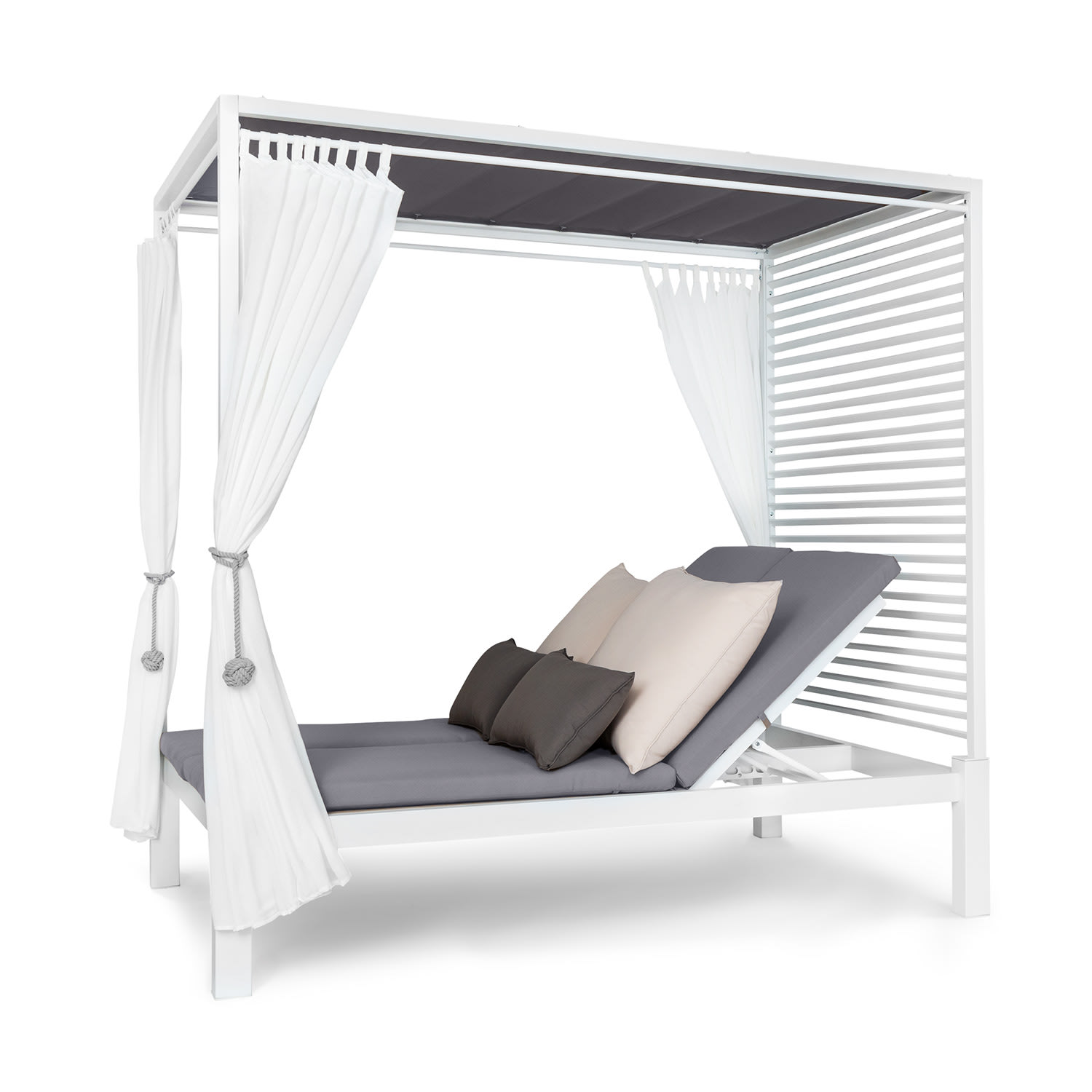 Posteľ s nebesami v exteriéri: môže byť v lete niečo krajšie? V záhrade alebo na terase, na relaxačný popoludňajší odpočinok alebo dokonca na nočný spánok pod hviezdami – exkluzívne záhradné lehátko Blumfeldt Eremitage Double Lux v tvare krásnej postele s nebesami pozýva na oddych. Očarí už na pohľad a prekvapí ťa maximálnym pohodlím. Na tento účel je lehátko vybavené mäkkým čalúnením, ktoré má hrúbku 6 cm. Chrbtovú opierku môžeš nastaviť do 4 rôznych polôh podľa vlastných preferencií – na čítanie, spanie, snívanie a podobne. Zadná stena je zhotovená z jednotlivých lamiel, takže aj pri zatiahnutých závesoch bude prúdenie vzduchu dobré. Počas hodín na slnku a pri pozorovaní hviezdnej oblohy môžeš otvoriť strechu a odsunúť ju podľa potreby. Zatvorená ťa optimálne chráni pred silným slnečným žiarením.Okrem jedinečného komfortu a luxusného dizajnu postele s nebesami záhradné lehátko Eremitage Double Lux zaujme predovšetkým svojou stabilitou. Robustný rám vyrobený z ocele s práškovou povrchovou úpravou ponúka pevné postavenie, zatiaľ čo materiály odolávajú vplyvom počasia. Bočné závesy, poťahy čalúnenia a strecha sú vyrobené z nepremokavého polyesteru. Vďaka pekným šnúram môžeš pripevniť závesy na bočné nosníky a relaxovať tak v kráľovskej atmosfére.Nebeské súkromie na čerstvom vzduchu: exkluzívne záhradné lehátko Eremitage Double Lux od spoločnosti Blumfeldt poskytuje miesto pre 2 ľudí a pozýva na oddych pod holým nebom.
