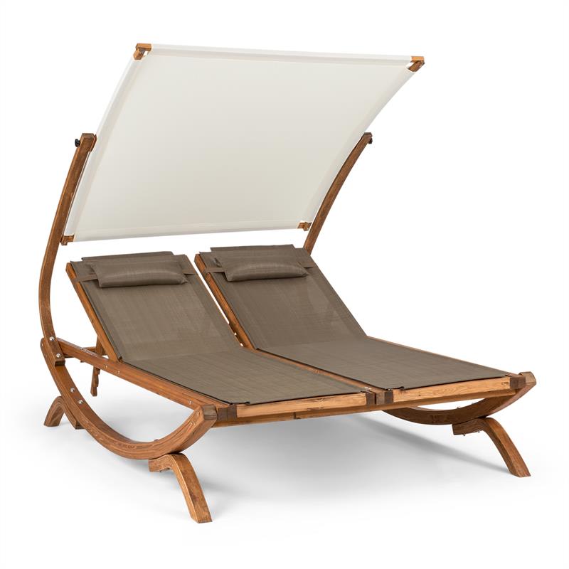 5-hviezdičková rezervácia pre dvoch: pretože s lehátkom Blumfeldt Sonnendeck je vyhradené rovno dvojité lehátko. Bez náročného cestovania strávite najkrajšie letné hodiny na terase alebo v záhrade.Podľa 5-hviezdičkového štandardu ponúka záhradné lehátko Blumfeldt najvyššiu úroveň luxusu. Tvar, farba a pohodlie vytvárajú harmonický súlad pre zasnené hodiny v prírode. Farebný koncept v elegantných prírodných tónoch a tiež moderný zaoblený tvar poskytujú dvojitému lehátku pôsobivý dizajn. Rovnako ako pri pohodlnej hojdacej sieti sa postará natiahnutá plocha na ležanie z priedušnej polyesterovej sieťoviny o príjemne vetraný podklad. Dva vankúše navyše poskytujú dokonalú relaxáciu. Stabilná konštrukcia zo smrekovcového dreva nie je skúpa na priestor: mimoriadne veľká plocha na ležanie pozýva na výdatný odpočinok vo dvojici a poskytne dostatok miesta na pohodlný odpočinok aj vysokým ľuďom.Keď začnú slnečné lúče štekliť nos, v okamihu sa dá nastaviť slnečná strieška tak, aby lehátko Sonnendeck Blumfeldt bolo opäť pokojným miestečkom v tieni. 5-násobne nastaviteľná slnečná clona je vyrobená z nepremokavého polyesteru a svojou veľkou plochou chráni pred slnečnými lúčmi.Dokonalý luxus v hlavnej sezóne: s dvojitým lehátkom Blumfeldt sú rezervované vždy tie najkrajšie miesta na slnku a sny o dovolenke sa stanú realitou už v záhrade.