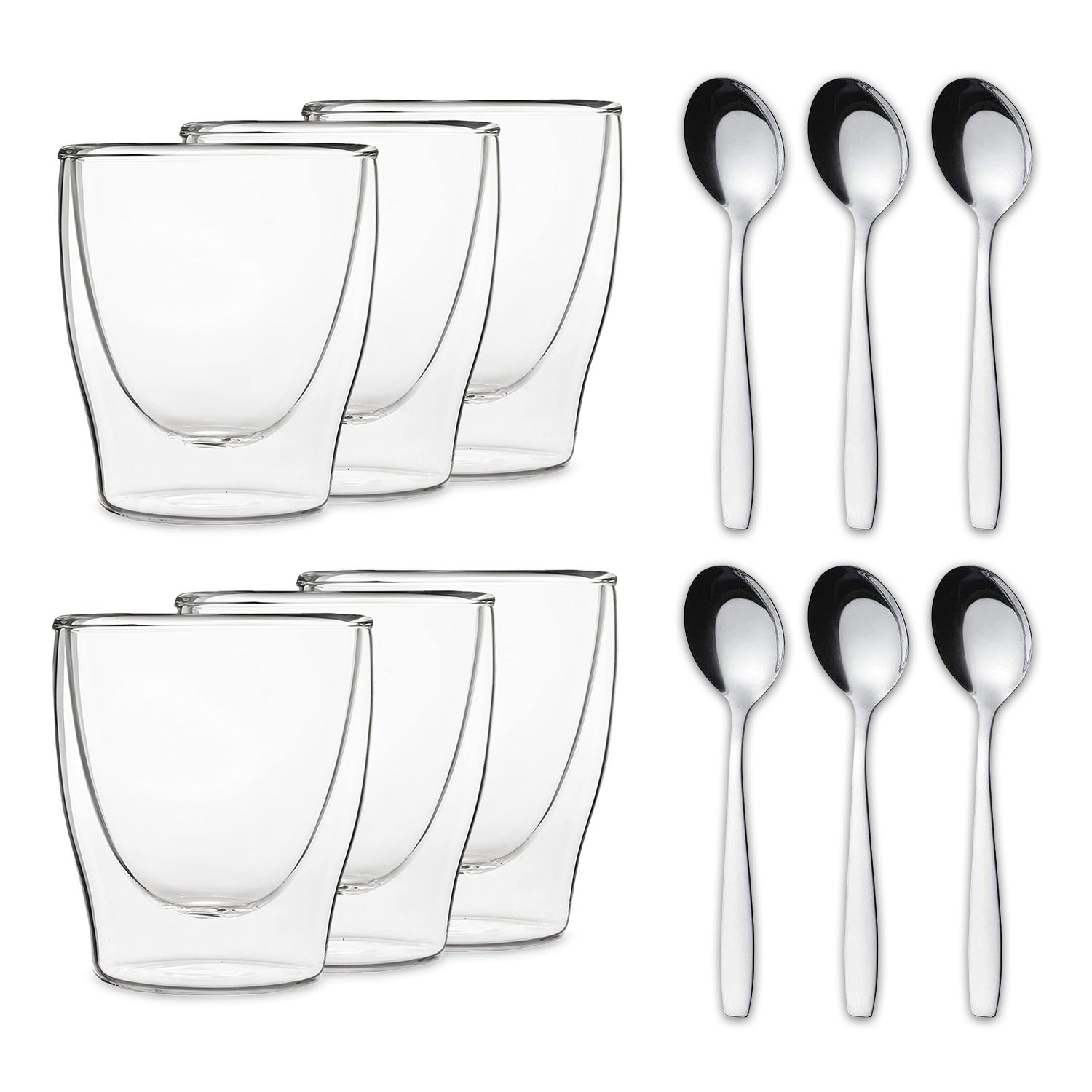Luxusný pohár DUOS od Feelino by Klarstein je vyrobený ručne a svojím elegantným dizajnom obohatí vaše obytné prostredie. Dvojitá sklenená vrstva udrží studené nápoje dlhšie studené a teplé nápoje dlhšie teplé. Tento atraktívny pohár na espresso, čaj, panáky, aperitívy alebo dezerty je vyrobená z borosilikátového skla a je mimoriadne odolný a žiaruvzdorný: Je odolný proti poškriabaniu, veľmi ľahký a samozrejme vhodný do umývačky riadu. Systém dvojitých stien poskytuje aj úžasný optický efekt, vďaka ktorému sa zdá, že sa kvapaliny vznášajú. Vďaka lyžičke z nehrdzavejúcej ocele ku každému poháru je sada pohárov dokonalá!Štýlové, robustné a ručne vyrobené – dvojstenné termo poháre DUOS od spoločnosti Feelino by Klarstein.