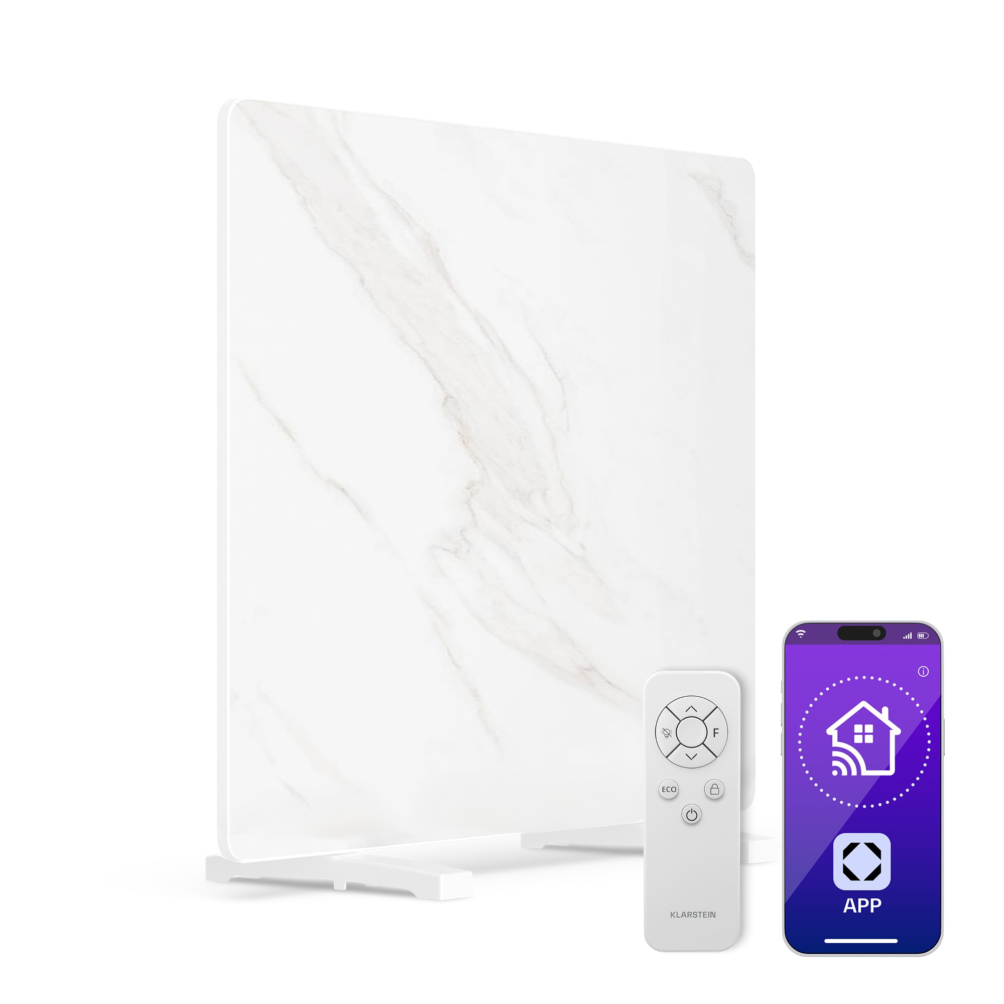 Infračervený panel Klarstein MarmoHeat kombinuje štýlový dizajn s účinnosťou, vysokým výkonom a pohodlnou obsluhou.Vyhrieva miestnosti s veľkosťou do 6 – 12 m² s výkonom 420 W. Infračervený panel pracuje vždy efektívne a ticho. Možno ho ovládať stlačením tlačidla, diaľkovým ovládačom, prostredníctvom aplikácie Klarstein alebo digitálnych asistentov, ako sú Alexa a Google Home od spoločnosti Amazon.Možno ho nainštalovať na stenu pomocou dodaného nástenného držiaka, ale infračervený ohrievač možno používať aj ako voľne stojaci spotrebič. To znamená, že ho možno umiestniť flexibilne a vždy v súlade s požiadavkami.Vďaka elegantnému mramorovému vzhľadu vnesie panel do vášho obytného priestoru elegantný nádych a vďaka ochrane proti prehriatiu a detskej poistke je aj bezpečný. Optimálnu účinnosť zaručuje aj elektrický termostat, časovač a detekcia otvoreného okna.