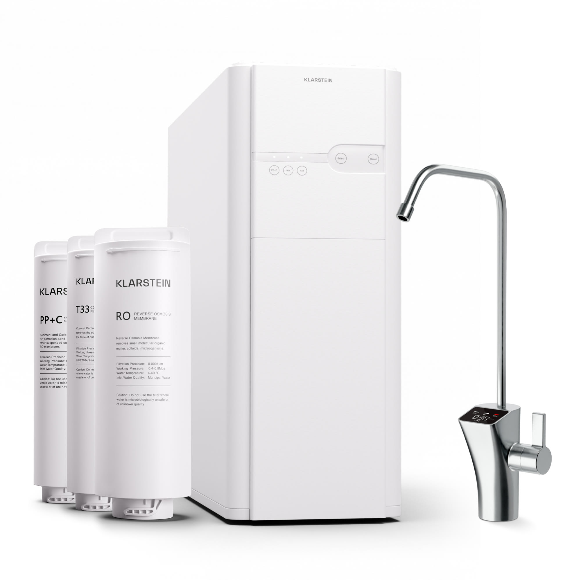 Odteraz prúdi z vášho vodného filtračného systému Klarstein PureFina 600 už len čistá studená voda, ktorá vás osvieži.Aby bola vaša každodenná voda bez suspendovaných častíc, mikróbov a aróm, vodný filter Klarstein PureFina ju čistí pomocou 3 filtrov v 5-stupňovom systéme. Odstraňuje viac ako 1000 druhov nečistôt, ako sú olovo, chloridy, fluoridy, ťažké kovy, vodný kameň, príchute a zápachy, čím zabezpečí, že voda bude taká čistá, ako nikdy predtým. Vďaka rýchlosti filtrácie 2 ku 1 z nefiltrovanej vody na filtrovanú má systém porovnateľne malé straty vody a prečistí až 600 GPD (2 270 litrov) vody za deň. To znamená približne jeden liter filtrovanej vody za minútu. Systém nad a pod umývadlovou skrinkou tiež dobre vyzerá. Vďaka svojmu dizajnu bez nádrže zaberá o 70 % menej miesta ako bežné filtre na reverznú osmózu , a preto sa zmestí do takmer každej skrinky s umývadlom. Inteligentné výstražné systémy priamo na vodovodnom kohútiku vám pri každom použití ukazujú stav filtrov a včas vás upozornia, keď je potrebné vymeniť jeden z troch filtrov. Nemusíte sa však obávať: PPT i T33 filter vydržia až jeden rok a RO filter až dva roky, v závislosti od znečistenia zdrojovej vody a frekvencie používania systému. Pribalená inteligentná batéria sa jednoducho nainštaluje na umývadlo pomocou jediného otvoru.Sviežosť z kohútika: Vodný filtračný systém Klarstein PureFina 600 sa teraz postará o ešte čistejšiu vodu.