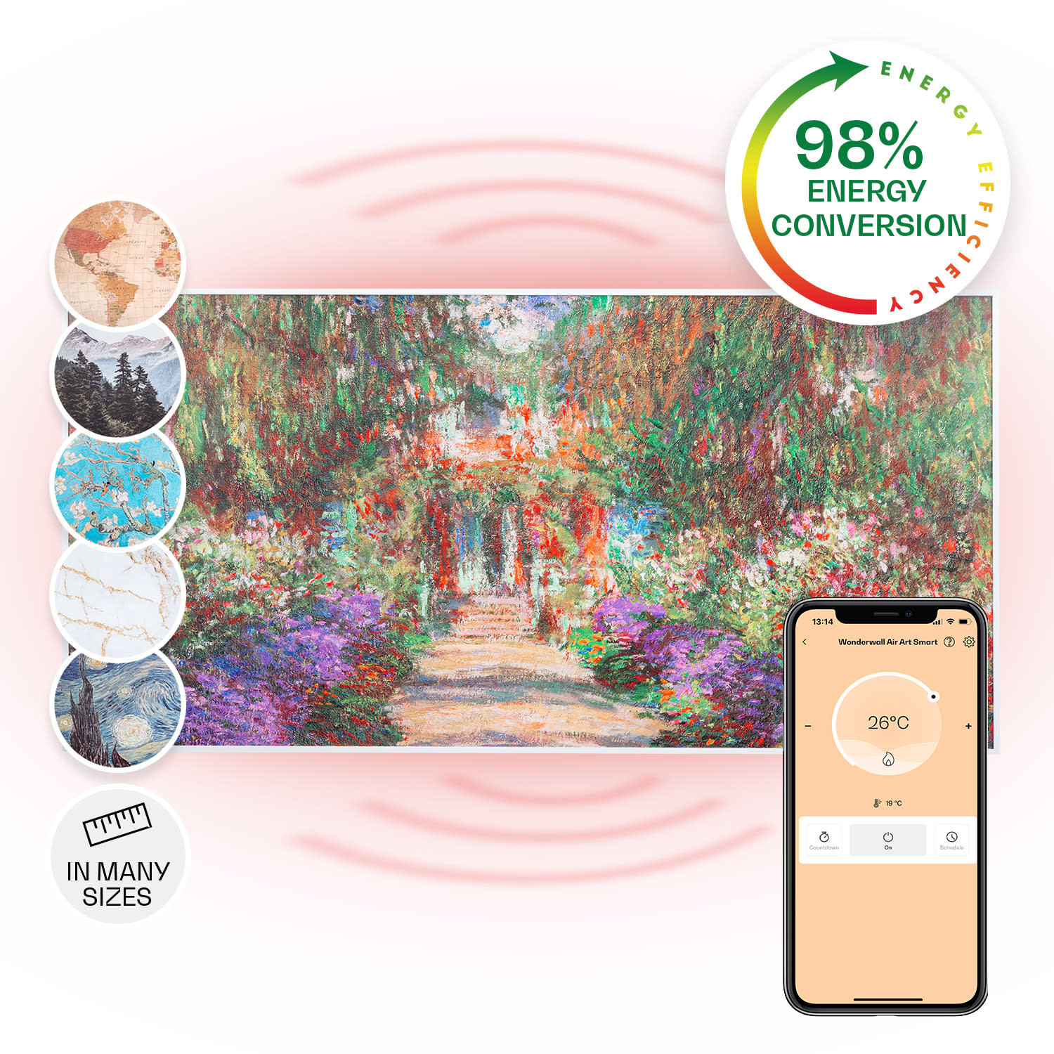 So smart technológiou na vytvorenie príjemného tepla: infračervený ohrievač Klarstein Wonderwall Air Art Smart prináša teplo do každej miestnosti veľmi efektívnym a priestorovo úsporným spôsobom a zároveň prináša so svojím povrchom s potlačeným grafickým dizajnom do miestnosti aj nový lesk a farby.Infračervený ohrievač Klarstein Wonderwall Air Art Smart predstavuje revolúciu vo vykurovaní vďaka modernej technológii. Super plochý vykurovací panel môžeš zavesiť ako infrapanel obraz priamo na stenu, kde okamžite začne vykonávať svoju zohrievaciu službu mimoriadne priestorovo úsporne. So svojím výkonom 700 W využíva vďaka technológii IR ComfortHeat princíp slnečného tepla: namiesto pomalého zohrievania vzduchu vydáva príjemné infračervené žiarenie, ktoré priamo zohrieva osoby a predmety na ploche približne 14 m². Tvoj nový elektrický ohrievač je pritom mimoriadne energeticky efektívny: celých 98 % spotrebovanej energie sa premení na tepelné žiarenie. A pretože zariadenie Wonderwall pracuje len s tepelným žiarením, nevíri prach ani nevytvára hluk – preto je ideálnou voľbou pre alergikov a na použitie v priestoroch citlivých na hluk, ako sú kancelárie alebo spálne. Vďaka svojmu dizajnovému povrchu s grafickou potlačou je nielen zdrojom tepla, ale aj dekoratívnym pútavým doplnkom každej miestnosti.Teraz ešte inteligentnejší: nové infračervené ohrievače Klarstein Wonderwall Air Art Smart sa dajú pripojiť k miestnej sieti WiFi a potom sa dajú ovládať odkiaľkoľvek pomocou aplikácie Klarstein App Experience. Nemusíš ani chytiť svoj smartfón alebo tablet, pretože s integrovaným hlasovým ovládaním môžeš úplne jednoducho zadávať hlasové pokyny jednému zariadeniu alebo viacerým zariadeniam súčasne prostredníctvom Alexy alebo Google. Vykurovací panel sa dá, samozrejme, ovládať aj kompletne manuálne na zariadení.S termostatom a premyslenými funkciami, ako sú funkcia automatického vypnutia a detekcia otvoreného okna OpenWindow Detection, splní infračervený ohrievač aj náročné požiadavky. Nastaviteľný týždenný časový spínač umožňuje programovanie časov kúrenia na každý deň týždni. Vďaka svojmu plochému dizajnu, rýchlemu tepelnému výkonu a priestorovo úspornej montáži na stenu je ohrievač predurčený predovšetkým na použitie v kúpeľni. Preto je zariadenie Wonderwall Air Art Smart s triedou ochrany IP44 úplne chránené proti striekajúcej vode.Budúcnosť vykurovacej techniky: infračervený ohrievač Klarstein Wonderwall Air Art Smart.