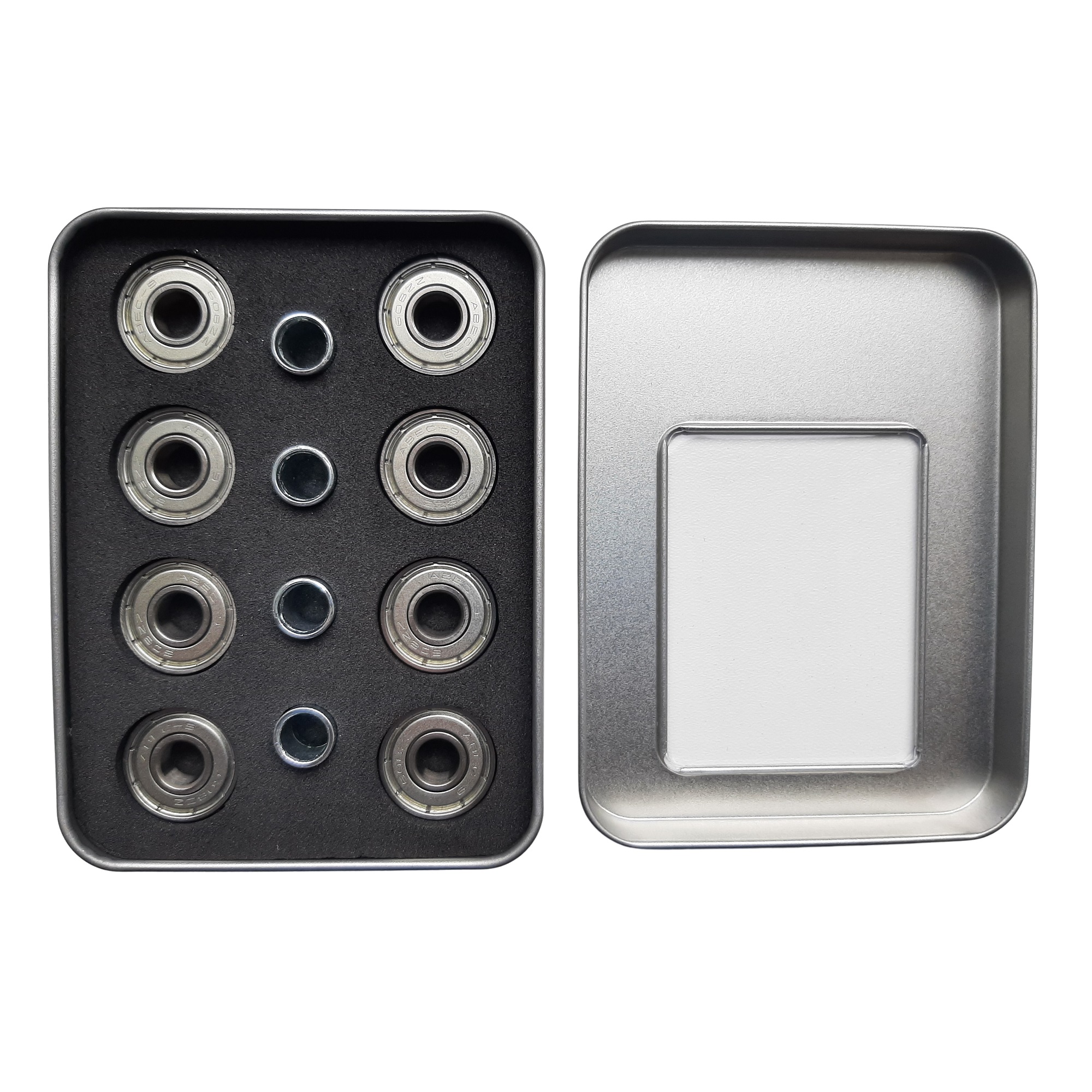 Súprava náhradných ložísk ABEC 9 pre skateboardy v luxusnej kovovej krabičke. Súčasťou balenia je 8 ks ložísk ABEC 9 a 4 ks dištančných puzdier.