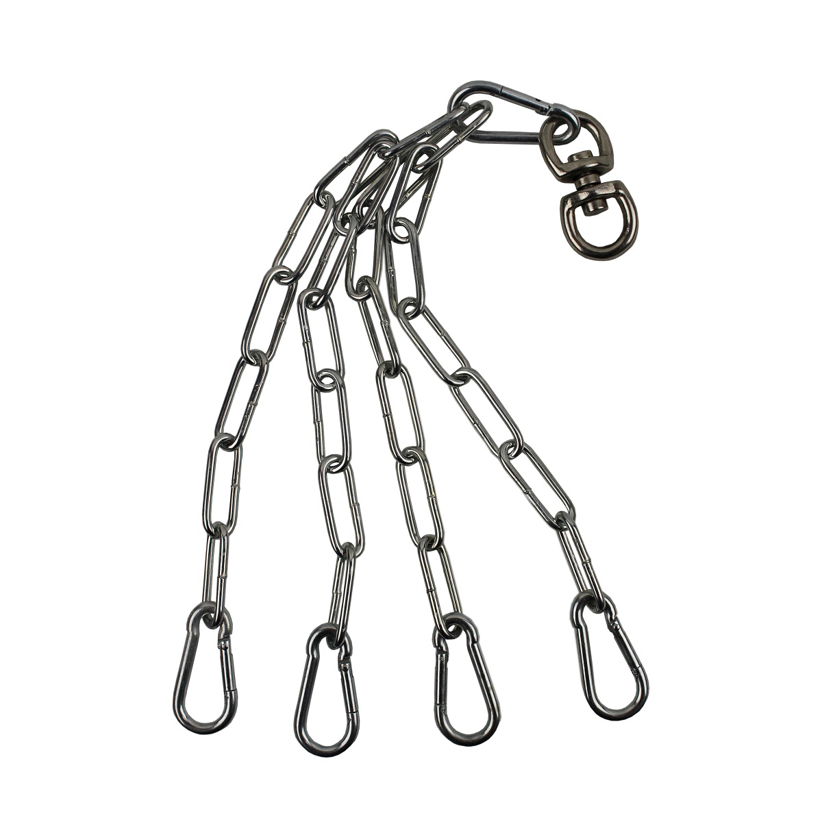 Náhradná štvorramenná reťaz na boxovacie vrece. Reťaz obsahuje otočnú kovovú sponu, ktorá podstatne zlepšuje tréning na boxovacom vreci. Držiak je ďalej opatrený karabínami pre uchytenie vreca.