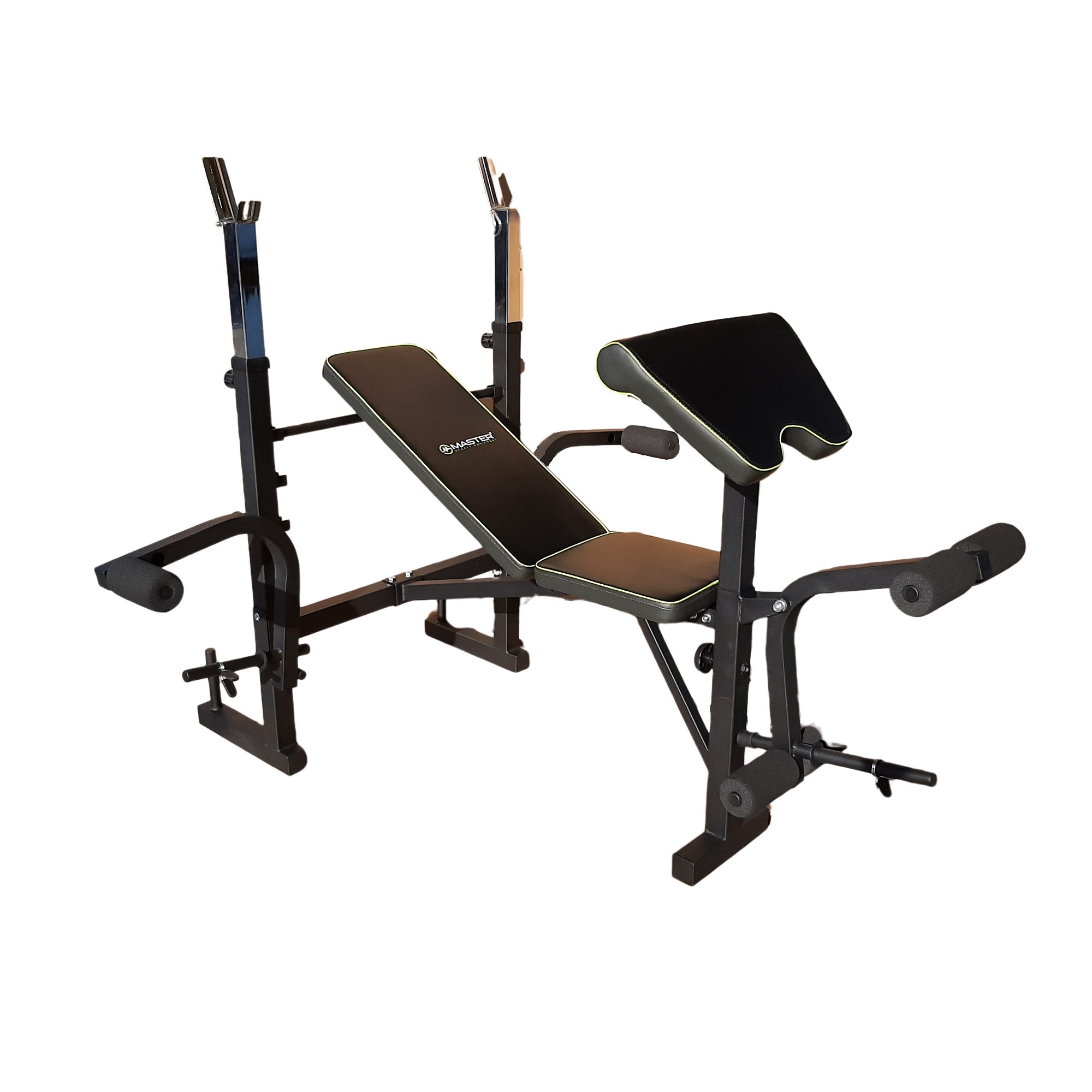 Kompaktná posilňovacia lavica pod veľkú činku MASTER Rambo 3 pre mnohostranné posilňovanie a svalový tréning. Lavička ponúka výškovo nastaviteľný stojan pre cvičenie s veľkou činkou s bezpečnostnými závlačkami, motýlik, predkopávanie / zakopávanie.