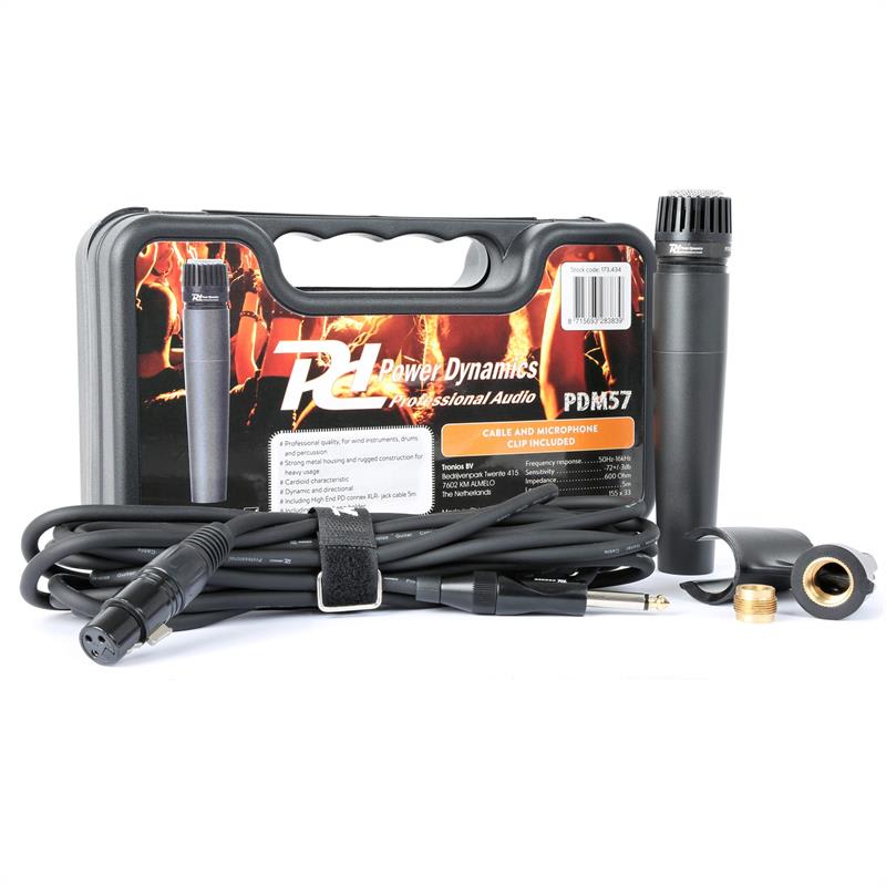 Power Dynamics PDM57, dynamický mikrofón, XLR, vrátane kábla, držiaka, adaptéra